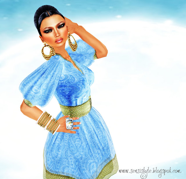 Today I'm wearing a silk embroidered tunic from Indie Rose. It comes in an array of beautiful colors, blue happens to be my favorite. I love how the gold trim makes the tunic have a regal feel. Complimented by big gold hoops and a sleek parted up do from Paper Couture...I look simply beautiful :)